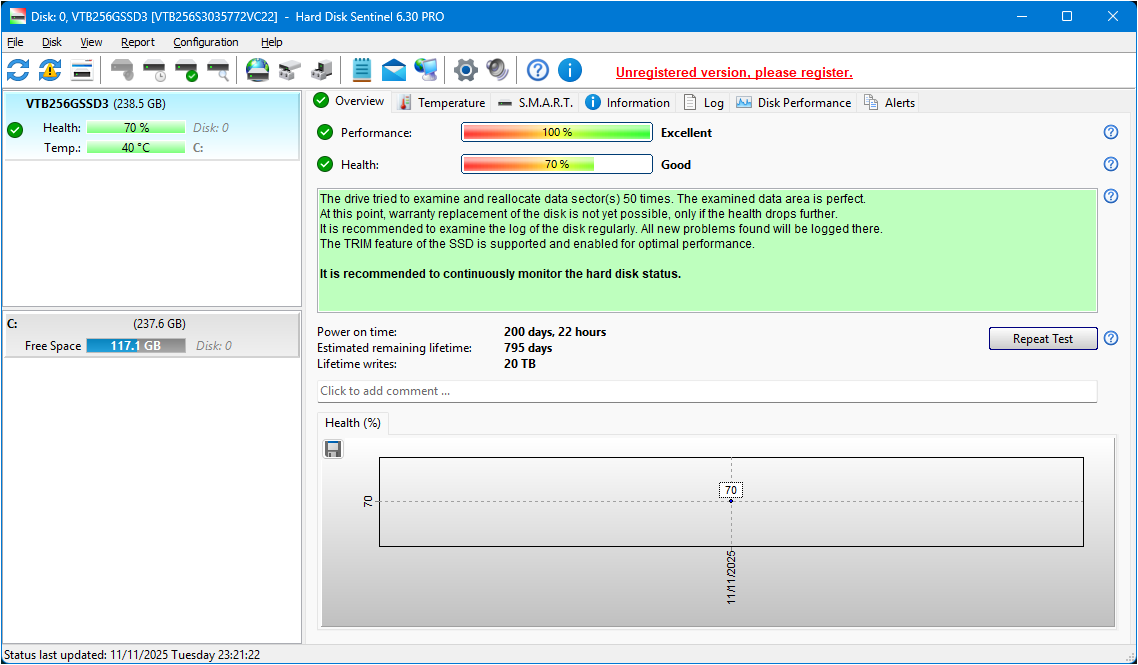 You can use HD Sentinel or CrystalDiskInfo to check the health of the drive.